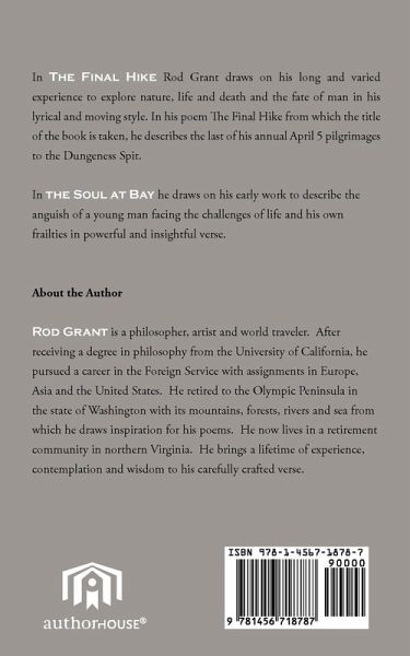 In The Final Hike Rod Grant draws on his long and varied experience to explore nature, life and death and the fate of man in his lyrical and moving style. In his poem The Final Hike from which the title of the book is taken, he describes the last of his annual April 5 pilgrimages to the Dungeness Spit. In the Soul at Bay he draws on his early work to describe the anguish of a young man facing the challenges of life and his own frailties in powerful and insightful verse.