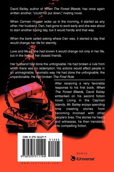 David Bailey, author of When The Forest Bleeds, has once again written another, "could not put down," riveting novel. When Carmen Hopper woke up in the morning, it started as any other. Her husband, Dan, had gone to work early and she was about to start another boring day, but it would hardly end that way. When the bank called asking where Dan was, it started a day that would change her life for eternity. Love and life as she had known it would change not only in her life, but in the lives of her closest friends. Her husband had done the unforgivable. He had broken a rule from which there was no redemption. His actions would affect people in an unimaginable, traumatic way. He had done the unforgivable, the unpardonable. He had broken The Final Rule.