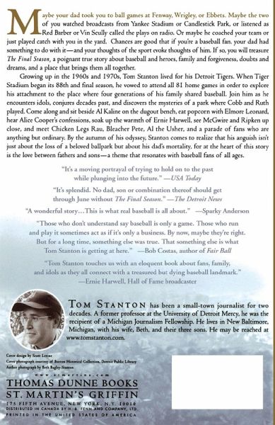 Tom Stanton's The Final Season offers a powerful memoir of fathers, sons, and the end of a baseball era. Maybe your dad took you to ball games at Fenway, Wrigley, or Ebbets. Maybe the two of you watched broadcasts from Yankee Stadium or Candlestick Park, or listened as Red Barber or Vin Scully called the plays on radio. Or maybe he coached your team or just played catch with you in the yard. Chances are good that if you're a baseball fan, your dad had something to do with it--and your thoughts of the sport evoke thoughts of him. If so, you will treasure The Final Season, a poignant true story about baseball and heroes, family and forgiveness, doubts and dreams, and a place that brings them all together. Growing up in the 60s and 70s, Tom Stanton lived for his Detroit Tigers. When Tiger Stadium began its 88th and final season, he vowed to attend all 81 home games in order to explore his attachment to the place where four generations of his family have shared baseball. Join him as he encounters idols, conjures decades past, and discovers the mysteries of a park where Cobb and Ruth played. Come along and sit beside Al Kaline on the dugout bench, eat popcorn with Elmore Leonard, hear Alice Cooper's confessions, soak up the warmth of Ernie Harwell, see McGwire and Ripken up close, and meet Chicken Legs Rau, Bleacher Pete, Al the Usher, and a parade of fans who are anything but ordinary. By the autumn of his odyssey, Stanton comes to realize that his anguish isn't just about the loss of a beloved ballpark but about his dad's mortality, for at the heart of this story is the love between fathers and sons--a theme that resonates with baseball fans of all ages.
