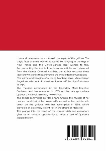 Love and hate were once the main purveyors of the gallows. The tragic fates of three women executed by hanging in the days of New France and the United-Canada bear witness to this. Reconstructing the events from historical articles and, above all, from the Ottawa Criminal Archives, the author recounts these little-known stories that animated the lives of former Canadians: ¿The crime and hanging of a young Montreal slave, Marie-Joseph Angélique, who, out of hatred, set fire to half the city of Montreal in 1734. ¿the murders perpetrated by the legendary Marie-Josephte Corriveau, and her execution in 1763, on the very spot where Quebec's National Assembly now stands. ¿the crimes committed by Marie-Anne Crispin, the murder of her husband and that of her lover's wife, as well as her problematic death on the gallows with her accomplice in 1858, which provoked an extremely violent riot in the streets of Montreal. This plunge into the heart of the crimes, trials and executions gives us an unusual opportunity to relive a part of Quebec's judicial History.