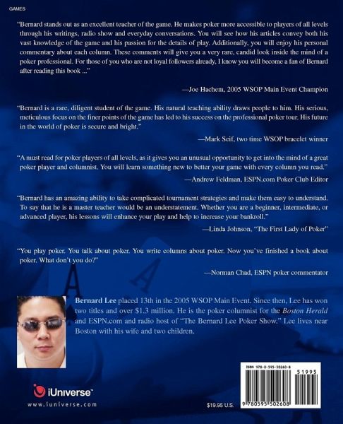 "Bernard stands out as an excellent teacher of the game. He makes poker more accessible to players of all levels through his writings, radio show and everyday conversations. You will see how his articles convey both his vast knowledge of the game and his passion for the details of play. Additionally, you will enjoy his personal commentary about each column. These comments will give you a very rare, candid look inside the mind of a poker professional. For those of you who are not loyal followers already, I know you will become a fan of Bernard after reading this book ..." Joe Hachem, 2005 WSOP Main Event Champion "Bernard is a rare, diligent student of the game. His natural teaching ability draws people to him. His serious, meticulous focus on the finer points of the game has led to his success on the professional poker tour. His future in the world of poker is secure and bright." Mark Seif, two time WSOP bracelet winner "A must read for poker players of all levels, as it give you an unusual opportunity to get into the mind of a great poker player and columnist. You will learn something new to better your game with every column you read." Andrew Feldman, ESPN.com Poker Club Editor "Bernard has an amazing ability to take complicated tournament strategies and make them easy to understand. To say that he is a master teacher would be an understatement. Whether you are a beginner, intermediate, or advanced player, his lessons will enhance your play and help to increase your bankroll." Linda Johnson, the First Lady of Poker "You play poker. You talk about poker. You write columns about poker. Now you've finished a book about poker. What don't you do?" Norman Chad, ESPN poker commentator