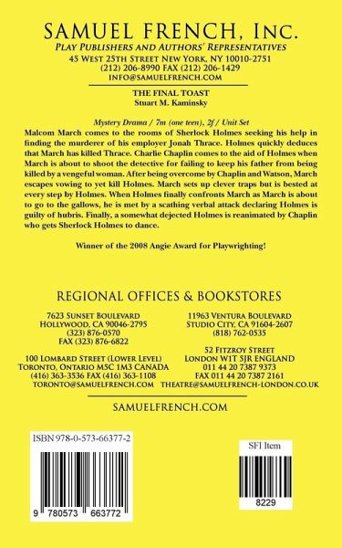 Mystery Drama / Stuart Kaminsky / 7m (one teen), 2f / Unit Set Winner of the 2008 Angie Award for Playwrighting! The Edgar Prize-winning author Kaminsky tells the tale of one of literature s most famous detectives: Sherlock Holmes. In a witty, imaginative story filled with twists and unexpected surprises, Detective Holmes unravels a murder only to find himself the unwilling target of the killer-at-large. Along with the aid of his loyal and inquisitive companion, Dr. Watson, Sherlock Holmes uses his masterful power of deduction to make a nebulous situation seem simply elementary. The Final Toast is an exciting new take on the classic characters of fiction we know and love, and its ending will please even the most savvy mystery connoisseurs. The Final Toast had its world premier at the 2008 International Mystery Writer's Festival."