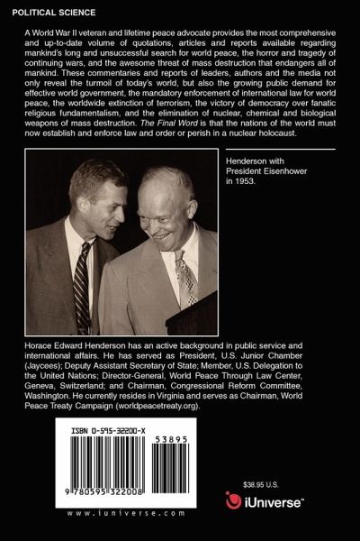 A World War II veteran and lifetime peace advocate provides the most comprehensive and up-to-date volume of quotations, articles and reports available regarding mankind's long and unsuccessful search for world peace, the horror and tragedy of continuing wars, and the awesome threat of mass destruction that endangers all of mankind. These commentaries and reports of leaders, authors and the media not only reveals the turmoil of today's world, but also the growing public demand for effective world government, the mandatory enforcement of international law for world peace, the worldwide extinction of terrorism, the victory of democracy over fanatic religious fundamentalism, and the elimination of nuclear, chemical and biological weapons of mass destruction. The Final Word is that the nations of the world must now establish and enforce law and order or perish in a nuclear holocaust.