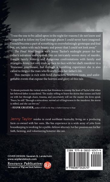 ""I was the one to be called upon in the night for reasons I do not know and compelled to follow my God through places I could never have imagined. I would become a part of something so overwhelmingly grotesque and foul but, yet, laden with such beauty and power that I could not look away."" The Final Word begins with Jenny Taylor's midnight prayer for her father's salvation and expands into an intricately woven story of murder, fraught family history, and dangerous confrontations with family and strangers. Jenny not only ends up face-to-face with her dad's murderer in a Tennessee courthouse, but through a humbling experience she is also called to forgive the man who brutally took her father's life. This memoir is rich with bold characters, Southern roots, and unforgettable events that expose the horrors and glory of this tale.