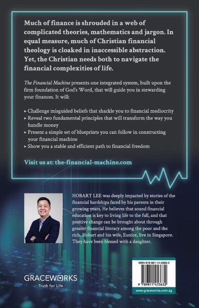 Much of finance is shrouded in a web of complicated theories, mathematics, and jargon. In equal measure, much of Christian financial theology is cloaked in inaccessible abstraction. Yet, the Christian needs both to navigate the financial complexities of life. The Financial Machine presents one integrated system, built upon the firm foundation of God's Word, that will guide you in stewarding your finances. It will:Challenge misguided beliefs that shackle you to financial mediocrity Reveal two fundamental principles that will transform the way you handle money Present a simple set of blueprints you can follow in constructing your financial machine Show you a stable and efficient path to financial freedom You can also visit the-financial-machine.com for more information.