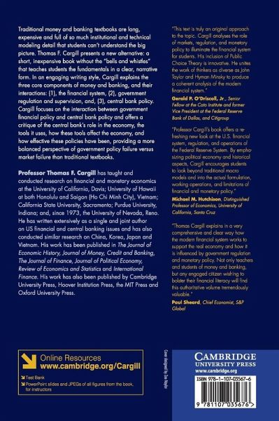 Traditional money and banking textbooks are long, expensive, and full of so much institutional and technical modeling detail that students cannot understand the big picture. Thomas F. Cargill presents a new alternative: a short, inexpensive book without the 'bells and whistles' that teaches students the fundamentals in a clear, narrative form. In an engaging writing style, Cargill explains the three core components of money and banking, and their interactions: 1) the financial system, 2) government regulation and supervision, and 3) central bank policy. Cargill focuses on the interaction between government financial policy and central bank policy and offers a critique of the central bank's role in the economy, the tools it uses, how these tools affect the economy, and how effective these policies have been, providing a more balanced perspective of government policy failure versus market failure than traditional textbooks.