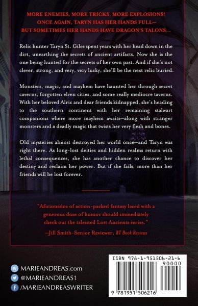 More enemies, more tricks, more explosions! Once again, Taryn has her hands full-but sometimes her hands have dragon's talons... Relic hunter Taryn St. Giles spent years with her head down in the dirt, unearthing the secrets of ancient artifacts. Now she is the one being hunted for the secrets of her own past. And if she's not clever, strong, and very, very lucky, she'll be the next relic buried. Monsters, magic, and mayhem have haunted her through secret caverns, forgotten elven cities, and some really mediocre taverns. With her beloved Alric and dear friends kidnapped, she's heading to the southern continent with her remaining stalwart companions where more mayhem awaits-along with stranger monsters and a deadly magic that twists her very flesh and bones. Old mysteries almost destroyed her world once-and Taryn was right there. As long-lost deities and hidden realms return with lethal consequences, she has another chance to discover her destiny and reclaim her power. But if she fails, more than her friends will be lost forever. Join the continuing adventures from the Lost Ancients series!