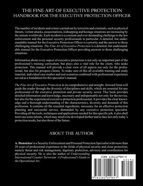 The number of incidents and crimes carried out by terrorists and criminals, such as physical threats, violent attacks, assassinations, kidnapping and hostage situations are increasing by the minute worldwide. Each incident is a constant and ever demanding challenge to the law enforcement and the personal security professionals in particular. A detailed, but understandable manual for the Executive Protection Officer is a priority and the answer to those challenging situations. The Fine Art of Executive Protection is a detailed, but understandable manual for the Executive Protection Officer providing answers to those challenging situations. Information about every aspect of executive protection is not only an important part of the professional's training curriculum, but plays also a vital role for the client, who seeks protection. This manual will provide a clear view of all aspects not only for the professional, but also for prospect clients. To make sure of this all available training and study material, individual case studies and real scenarios combined with professional experience served as a foundation for this specialist's manual. The Fine Art of Executive Protection in its comprehensive and straight- forward form will guide the reader through the diversity of disciplines and skills, which are essential for any professional of the executive protection and private security sector. This book provides detailed information and knowledge, necessary and indispensable not only for the novice, but also for the experienced executive protection professional. It provides the clear knowledge and a thorough understanding of the characteristics, diversity and demands of this profession. It contains all the essential ingredients, necessary for an effective protection planning and successful service, demanded by any executive protection specialist. Providing all the tools, techniques and applications needed for this specific job, it also shall motivate some talents, which may need to be developed further and to face not only today's protection needs, but also those of the future. The book not only contains detailed professional information for the person seeking a post in the "glamorous world" of the executive protection- business but also provides all the information necessary for those under threat and in need of close protection and a secure environment. A protection- seeking client will find detailed information about Executive Protection and Physical Security. Executive or Personal Protection, was once considered a service only and exclusive for the rich, famous and a few selected government officials. But recent events and an increase in violence, quickly transformed Executive Protection into a sought after service- commodity worldwide. Keeping this in mind, any part of this guide is therefore easily adaptable and adjusted to any region or country in the world. However, one must carefully consider and act within the local laws to assure a successful protection service.