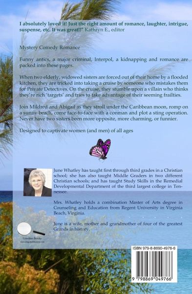 I absolutely loved it! Just the right amount of romance, laughter, intrigue, suspense, etc. It was great!!" Kathryn E., editor Mystery Comedy Romance Funny antics, a major criminal, Interpol, a kidnapping and romance are packed into these pages. When two elderly, widowed sisters are forced out of their home by a flooded kitchen, they are tricked into taking a cruise by someone who mistakes them for Private Detectives. On the cruise, they stumble upon a villain who thinks they're rich 'targets' and tries to take advantage of their seeming frailties. Join Mildred and Abigail as they stroll under the Caribbean moon, romp on a sunny beach, come face-to-face with a conman and plot a sting operation. Never have two sisters been more opposite, more charming, or funnier. Designed to captivate women (and men) of all ages.