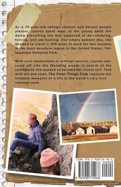 As a 20-year-old college student and devout people pleaser, Lauren spent most of her young adult life doing everything she was supposed to do-studying, testing, and job hunting. One empty summer day, she decided to travel 1,300 miles to work for two seasons in the most desolate region in the United States: Yellowstone National Park. With zero connections or internet service, Lauren ventured off into the Wyoming woods in search of the confidence she needed to become her truest self. Told with wit and style, The Finer Things Club captures the intimate moments of a life in the world's very first national park.