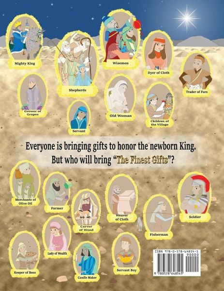 Everyone is bringing gifts to honor the newborn king, but who will bring "The Finest Gift?" "The Finest Gifts: A Christmas Story" is a beautifully illustrated, poetic adaptation of the traditional Christmas story, written from the perspective of those that traveled to the manger to see the baby Jesus. Among those traveling is an impoverished old woman who is bullied along the way for not bringing a gift. Having not spoken throughout the journey, all are silenced when she finally arrives at the stable and shares her message with the world. "The Finest Gifts: A Christmas Story"--A children's book for the whole family. Reading level: Grades 1 - 2 Audiobook available on our website: www.TheFinestGiftsBook.com