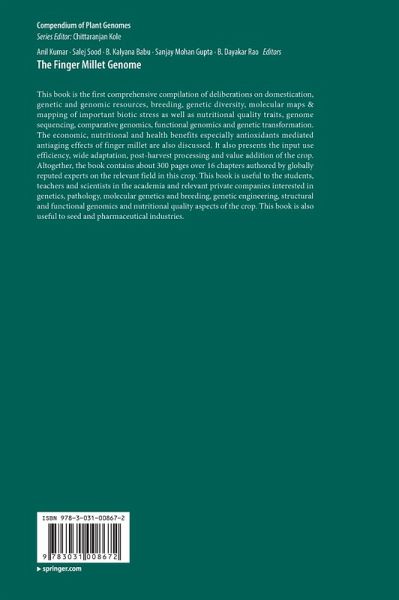 Chapter 1. History, Botanical and Taxonomic Description, Domestication and Spread.- Chapter 2. Economic, Nutritional and Health Importance.- Chapter 3. Genetic and Genomic Resources for Crop Improvement in Finger Millet.- Chapter 4. Paradigm Shift from Genetics to Genomics: Characterization of Diversity and Prospects of Molecular Markers.- Chapter 5. Molecular Mapping in Finger Millet.- Chapter 6. The Complete Genome Sequence of Finger Millet.- Chapter 7. Comparative Genomics in Finger Millet.- Chapter 8. Finger Millet Transcriptome Analysis Using High Throughput Sequencing Technologies.- Chapter 9. Seed Biology and Packaging of Finger Millet Using Omics Approaches for Nutritional Security.- Chapter 10. A Nutritional Crop Factory of Quality Seed Storage Proteins for Combating Malnutrition.- Chapter 11. Finger Millet Genome Analysis and Nutrient Transport.- Chapter 12. Finger Millet as Input Use Efficient and Organic By Default Crop.- Chapter 13. Molecular Basis of Biotic and Abiotic Stress Tolerance in Finger Millet.- Chapter 14. Genetic Transformation for Crop Improvement and Biofortification.- Chapter 15. Novel Prospective On Suppression of Ageing By The Consumption of Finger Millet.- Chapter 16. Finger Millet Holistic Value Chain Approach.
