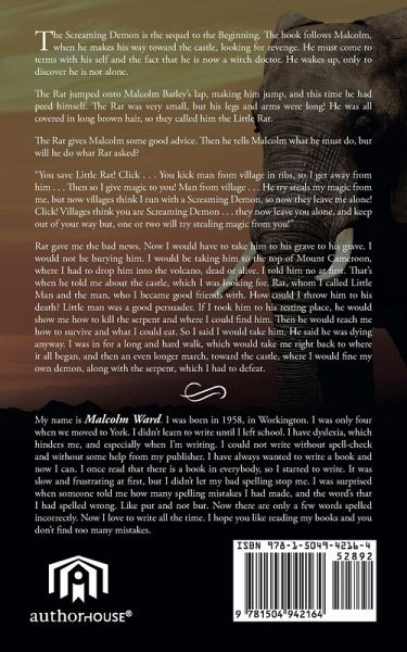 The Screaming Demon is the sequel to the Beginning. The book follows Malcolm, when he makes his way toward the castle, looking for revenge. He must come to terms with his self and the fact that he is now a witch doctor. He wakes up, only to discover he is not alone. The Rat jumped onto Malcolm Batley's lap, making him jump, and this time he had peed himself. The Rat was very small, but his legs and arms were long! He was all covered in long brown hair, so they called him the Little Rat. The Rat gives Malcolm some good advice. Then he tells Malcolm what he must do, but will he do what Rat asked? "You save Little Rat! Click . . . You kick man from village in ribs, so I get away from him . . . Then so I give magic to you! Man from village . . . He try steals my magic from me, but now villages think I run with a Screaming Demon, so now they leave me alone! Click! Villages think you are Screaming Demon . . . they now leave you alone, and keep out of your way but, one or two will try stealing magic from you!" Rat gave me the bad news. Now I would have to take him to his grave to his grave. I would not be burying him. I would be taking him to the top of Mount Cameroon, where I had to drop him into the volcano, dead or alive. I told him no at first. That's when he told me about the castle, which I was looking for. Rat, whom I called Little Man and the man, who I became good friends with. How could I throw him to his death? Little man was a good persuader. If I took him to his resting place, he would show me how to kill the serpent and where I could find him. Then he would teach me how to survive and what I could eat. So I said I would take him. He said he was dying anyway. I was in for a long and hard walk, which would take me right back to where it all began, and then an even longer march, toward the castle, where I would fine my own demon, along with the serpent, which I had to defeat.