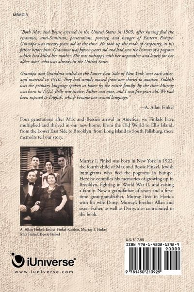 "Both Max and Bessie arrived in the United States in 1905, after having fled the tyrannies, anti-Semitism, persecutions, poverty, and hunger of Eastern Europe. Grandpa was twenty years old at the time. He took up the trade of carpentry, as his father before him. Grandma was fifteen years old and had seen the horrors of a pogrom which had killed her mother. She was unhappy with her stepmother and lonely for her older sister, who was already in the United States. Grandpa and Grandma settled in the Lower East Side of New York, met each other, and married in 1910. They had simply moved from one shtetel to another. Yiddish was the primary language spoken at home by the entire family. By the time Murray was born in 1922, Belle was twelve, Esther was nine, and I was five years old. We had been exposed to English, which became our second language." -A. Allan Finkel Four generations after Max and Bessie's arrival in America, we Finkels have multiplied and thrived in our new home. From the Old World to Ellis Island, from the Lower East Side to Brooklyn, from Long Island and South Fallsburg, these memoirs tell our story.