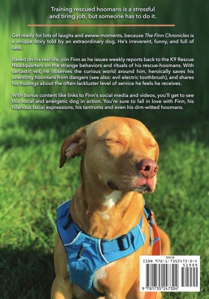 Training rescued hoomans is a ruff job, but somedoggy has to do it. The Finn Chronicles is a unique story told by an extraordinary dog. He's irreverent, funny, and full of sass. Based on his real life, join Finn as he issues weekly reports back to K9 Rescue Headquarters on the strange behaviors and rituals of his rescue-hoomans. With sarcastic wit, he observes the curious world around him, heroically saves his unwitting hoomans from dangers (see also: evil electric toothbrush), and shares his musings about the often-lackluster level of service he feels he receives. With bonus content like links to Finn's social media and videos, you'll get to see this vocal and energetic dog in action. You're sure to fall in love with Finn, his hilarious facial expressions, his tantrums and even his dim-witted hoomans. This is the light-hearted and funny read we need in these not so light-hearted times. Quick Facts: - #1 Best Seller on Amazon's Hot New Releases within a week of publishing! - Finalist in the 2021 National Indie Excellence Awards for HUMOR - Winner in the 2021 International Royal Dragonfly Competition - Outstanding reviews - even by a cat lover and someone who has never owned a dog! - Available for Kindle or Paperback - Already sold into the US, UK, Canada, Germany, Australia, Switzerland and Cambodia Don't miss your chance to fall in love with Finn and follow him on social media for year round laughs and love!