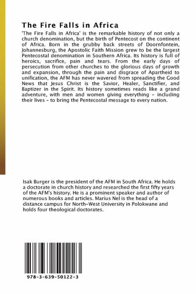 'The Fire Falls in Africa' is the remarkable history of not only a church denomination, but the birth of Pentecost on the continent of Africa. Born in the grubby back streets of Doornfontein, Johannesburg, the Apostolic Faith Mission grew to be the largest Pentecostal denomination in Southern Africa. Its history is full of heroics, sacrifice, pain and tears. From the early days of persecution from other churches to the glorious days of growth and expansion, through the pain and disgrace of Apartheid to unification, the AFM has never wavered from spreading the Good News that Jesus Christ is the Savior, Healer, Sanctifier, and Baptizer in the Spirit. Its history sometimes reads like a grand adventure, with men and women giving everything - including their lives - to bring the Pentecostal message to every nation.