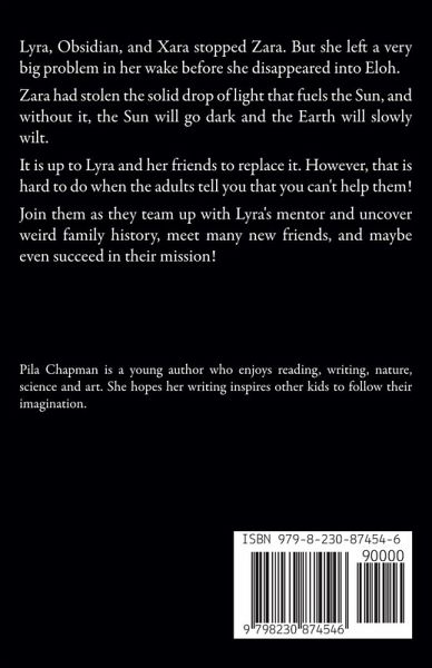 Lyra, Obsidian, and Xara stopped Zara. But she left a big problem in her wake before disappearing into Eloh. Zara has stolen the solid drop of light that fuels the Sun. Without it, the Sun will go dark, and the Earth will slowly wilt. It is up to Lyra and her friends to replace it. However, that is hard to do when the adults tell you that you can't help them! Join them as they team up with Lyra's mentor, uncover weird family history, meet many new friends, and possibly even succeed in their mission!