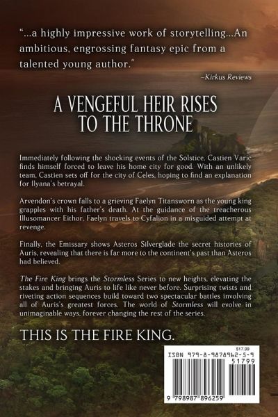 Immediately following the shocking events of the Solstice, Castien Varic finds himself forced to leave his home city for good. With an unlikely team, Castien sets off for the city of Celes, hoping to find an explanation for Ilyana's betrayal. Arvendon's crown falls to a grieving Faelyn Titansworn as the young king grapples with his father's death. At the guidance of the treacherous Illusomancer Eithor, Faelyn travels to Cyfalion in a misguided attempt at revenge. Finally, the Emissary shows Asteros Silverglade the secret histories of Auris, revealing that there is far more to the continent's past than Asteros had believed. The Fire King brings the Stormless Series to new heights, elevating the stakes and bringing Auris to life like never before. Surprising twists and riveting action sequences build toward two spectacular battles involving all of Auris's greatest forces. The world of Stormless will evolve in unimaginable ways, forever changing the rest of the series. This is The Fire King.
