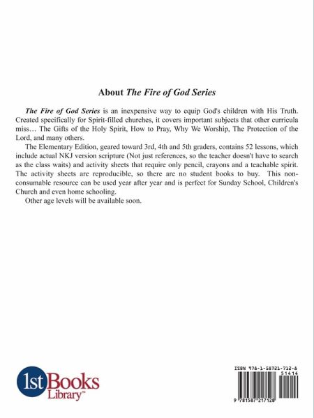 The Fire of God Series is an inexpensive way to equip God s children with His Truth. Created specifically for Spirit-filled churches, it covers important subjects that other curricula miss The Gifts of the Holy Spirit, How to Pray, Why We Worship, The Protection of the Lord, and many others. The Elementary Edition, geared toward 3rd, 4th and 5th graders, contains 52 lessons, which include actual NKJ version scripture (not just references, so the teacher doesn t have to search as the class waits.) and activity sheets that require only pencil, crayons and a teachable spirit. The activity sheets are reproducable, so there are no student books to buy. This non-consumable resource can be used year after year and is perfect for Sunday School, Children s Church and even home schooling. Other age levels will be available soon.