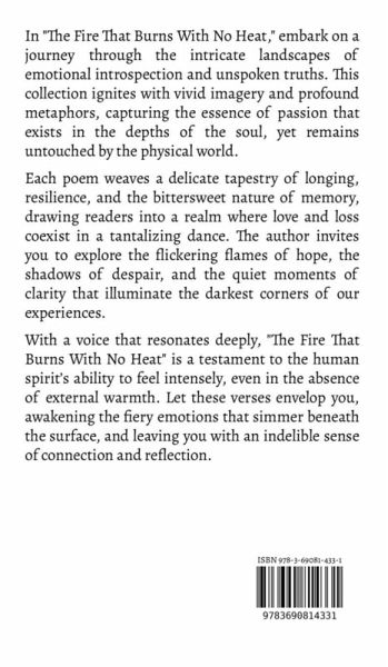 In "The Fire That Burns With No Heat," embark on a journey through the intricate landscapes of emotional introspection and unspoken truths. This collection ignites with vivid imagery and profound metaphors, capturing the essence of passion that exists in the depths of the soul, yet remains untouched by the physical world. Each poem weaves a delicate tapestry of longing, resilience, and the bittersweet nature of memory, drawing readers into a realm where love and loss coexist in a tantalizing dance. The author invites you to explore the flickering flames of hope, the shadows of despair, and the quiet moments of clarity that illuminate the darkest corners of our experiences. With a voice that resonates deeply, "The Fire That Burns With No Heat" is a testament to the human spirit's ability to feel intensely, even in the absence of external warmth. Let these verses envelop you, awakening the fiery emotions that simmer beneath the surface, and leaving you with an indelible sense of connection and reflection.