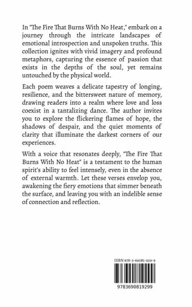In "The Fire That Burns With No Heat," embark on a journey through the intricate landscapes of emotional introspection and unspoken truths. This collection ignites with vivid imagery and profound metaphors, capturing the essence of passion that exists in the depths of the soul, yet remains untouched by the physical world. Each poem weaves a delicate tapestry of longing, resilience, and the bittersweet nature of memory, drawing readers into a realm where love and loss coexist in a tantalizing dance. The author invites you to explore the flickering flames of hope, the shadows of despair, and the quiet moments of clarity that illuminate the darkest corners of our experiences. With a voice that resonates deeply, "The Fire That Burns With No Heat" is a testament to the human spirit's ability to feel intensely, even in the absence of external warmth. Let these verses envelop you, awakening the fiery emotions that simmer beneath the surface, and leaving you with an indelible sense of connection and reflection.