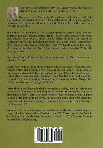 Dora Amy Elles (15 October 1877 - 28 January 1961), who wrote as Patricia Wentworth, was a British crime fiction writer. She was born in Mussoorie, Uttarakhand, India (then the British Raj), and was educated first privately, then at Blackheath High School for Girls in London. Her father was General Edmond Elles, and her mother was Lady Clare (Rothney) Elles. She and her first husband, Lt. Col. George Frederick Horace Dillon, had one daughter. She also became stepmother to Dillon's three sons, two of whom died during World War I. After Dillon's death, in 1906, she settled in Camberley, Surrey. In 1920, she married Lt. Col. George Oliver Turnbull. One of her stepsons who died in World War I had Wentworth as a middle name, after Wentworth Dillon, 4th Earl of Roscommon, and she adopted Wentworth as her pen name. Dora Amy Turnbull died on 28 January 1961, aged 83. Her His estate was valued at £24 561. Wentworth wrote a series of 32 crime novels in the classic whodunit style, featuring Miss Maud Silver, a retired governess and teacher who becomes a professional private detective, in London, England. Miss Silver works closely with Scotland Yard, especially Inspector Frank Abbott, and is fond of quoting the poet Tennyson. Miss Silver is sometimes compared to Jane Marple, the elderly detective created by Agatha Christie. "Miss Silver is well known in the better circles of society, and she finds entree to the troubled households of the upper classes with little difficulty. In most of Miss Silver's cases there is a young couple whose romance seems ill fated because of the murder to be solved, but in Miss Silver's competent hands the case is solved, the young couple are exonerated, and all is right in this very traditional world." Wentworth also wrote 34 books outside that series. She won the Melrose prize in 1910 for her first novel A Marriage Under The Terror, set in the French Revolution. Her novels were the topic of Jariel D. O'Neil's 1988 doctoral dissertation. (wikipedia.org)