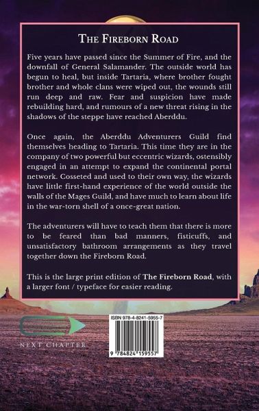 Five years have passed since the Summer of Fire, and the downfall of General Salamander. The outside world has begun to heal, but inside Tartaria, where brother fought brother and whole clans were wiped out, the wounds still run deep and raw. Fear and suspicion have made rebuilding hard, and rumours of a new threat rising in the shadows of the steppe have reached Aberddu. Once again, the Aberddu Adventurers Guild find themselves heading to Tartaria. This time they are in the company of two powerful but eccentric wizards, ostensibly engaged in an attempt to expand the continental portal network. Cosseted and used to their own way, the wizards have little first-hand experience of the world outside the walls of the Mages Guild, and have much to learn about life in the war-torn shell of a once-great nation. The adventurers will have to teach them that there is more to be feared than bad manners, fisticuffs, and unsatisfactory bathroom arrangements as they travel together down the Fireborn Road. This is the large print edition of The Fireborn Road, with a larger font / typeface for easier reading.