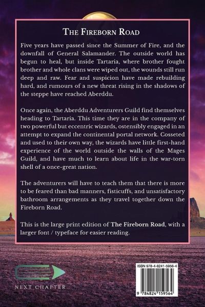 Five years have passed since the Summer of Fire, and the downfall of General Salamander. The outside world has begun to heal, but inside Tartaria, where brother fought brother and whole clans were wiped out, the wounds still run deep and raw. Fear and suspicion have made rebuilding hard, and rumours of a new threat rising in the shadows of the steppe have reached Aberddu. Once again, the Aberddu Adventurers Guild find themselves heading to Tartaria. This time they are in the company of two powerful but eccentric wizards, ostensibly engaged in an attempt to expand the continental portal network. Cosseted and used to their own way, the wizards have little first-hand experience of the world outside the walls of the Mages Guild, and have much to learn about life in the war-torn shell of a once-great nation. The adventurers will have to teach them that there is more to be feared than bad manners, fisticuffs, and unsatisfactory bathroom arrangements as they travel together down the Fireborn Road. This is the large print edition of The Fireborn Road, with a larger font / typeface for easier reading.