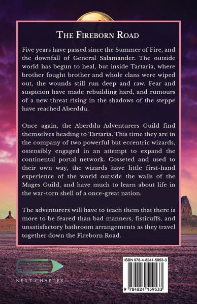 Five years have passed since the Summer of Fire, and the downfall of General Salamander. The outside world has begun to heal, but inside Tartaria, where brother fought brother and whole clans were wiped out, the wounds still run deep and raw. Fear and suspicion have made rebuilding hard, and rumours of a new threat rising in the shadows of the steppe have reached Aberddu. Once again, the Aberddu Adventurers Guild find themselves heading to Tartaria. This time they are in the company of two powerful but eccentric wizards, ostensibly engaged in an attempt to expand the continental portal network. Cosseted and used to their own way, the wizards have little first-hand experience of the world outside the walls of the Mages Guild, and have much to learn about life in the war-torn shell of a once-great nation. The adventurers will have to teach them that there is more to be feared than bad manners, fisticuffs, and unsatisfactory bathroom arrangements as they travel together down the Fireborn Road.