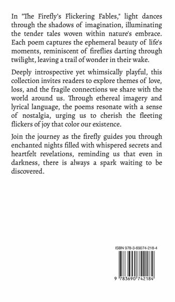 In "The Firefly's Flickering Fables," light dances through the shadows of imagination, illuminating the tender tales woven within nature's embrace. Each poem captures the ephemeral beauty of life's moments, reminiscent of fireflies darting through twilight, leaving a trail of wonder in their wake. Deeply introspective yet whimsically playful, this collection invites readers to explore themes of love, loss, and the fragile connections we share with the world around us. Through ethereal imagery and lyrical language, the poems resonate with a sense of nostalgia, urging us to cherish the fleeting flickers of joy that color our existence. Join the journey as the firefly guides you through enchanted nights filled with whispered secrets and heartfelt revelations, reminding us that even in darkness, there is always a spark waiting to be discovered.