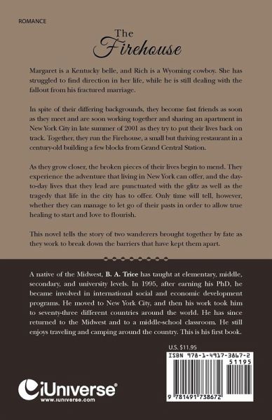 Margaret is a Kentucky belle, and Rich is a Wyoming cowboy. She has struggled to find direction in her life, while he is still dealing with the fallout from his fractured marriage. In spite of their differing backgrounds, they become fast friends as soon as they meet and are soon working together and sharing an apartment in New York City in late summer of 2001 as they try to put their lives back on track. Together, they run the Firehouse, a small but thriving restaurant in a century-old building a few blocks from Grand Central Station. As they grow closer, the broken pieces of their lives begin to mend. They experience the adventure that living in New York can offer, and the day-to-day lives that they lead are punctuated with the glitz as well as the tragedy that life in the city has to offer. Only time will tell, however, whether they can manage to let go of their pasts in order to allow true healing to start and love to flourish. This novel tells the story of two wanderers brought together by fate as they work to break down the barriers that have kept them apart.