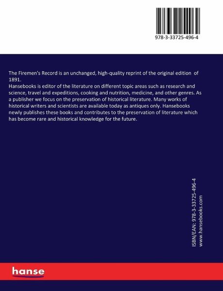 The Firemen's Record is an unchanged, high-quality reprint of the original edition of 1891.Hansebooks is editor of the literature on different topic areas such as research and science, travel and expeditions, cooking and nutrition, medicine, and other genres. As a publisher we focus on the preservation of historical literature. Many works of historical writers and scientists are available today as antiques only. Hansebooks newly publishes these books and contributes to the preservation of literature which has become rare and historical knowledge for the future.