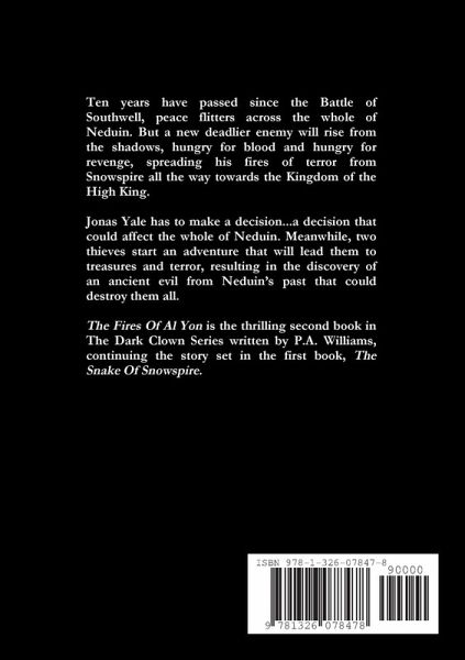 Ten years have passed since the Battle of Southwell, peace flitters across the whole of Neduin. But a new deadlier enemy will rise from the shadows, hungry for blood and hungry for revenge, spreading his fires of terror from Snowspire all the way towards the Kingdom of the High King. Jonas Yale has to make a decision...a decision that could affect the whole of Neduin. Meanwhile, two thieves start an adventure that will lead them to treasures and terror, resulting in the discovery of an ancient evil from Neduin's past that could destroy them all. The Fires Of Al Yon is the thrilling second book in The Dark Clown Series written by P.A. Williams, continuing the story set in the first book, The Snake Of Snowspire.