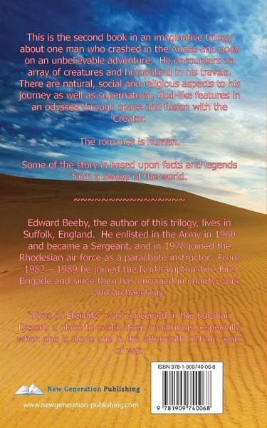 This is the second book in an imaginative trilogy about one man who crashed in the Andes and goes on an unbelievable adventure. He encounters an array of creatures and humankind in his travels. There are natural, social and religious aspects to his journey as well as supernatural, God-like features in an odyssey through space and fusion with the Creator. The romance is human. Some of the story is based upon facts and legends from a sweep of the world. ~~~~~~~~~~~~~~~~ Edward Beeby, the author of this trilogy, lives in Suffolk, England. He enlisted in the Army in 1960 and became a Sergeant, and in 1978 joined the Rhodesian air force as a parachute instructor. From 1982 - 1989 he joined the Northamptonshire Fire Brigade and since then has engaged in charity work and archaeology. "Fires of Eternity" was conceived in the Kalahari Desert, a place to evoke deep imaginings, especially when one is alone and in the aftermath of four years of war.
