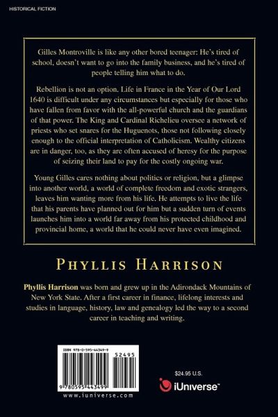 Gilles Montroville is like any other bored teenager: He's tired of school, doesn't want to go into the family business, and he's tired of people telling him what to do. Rebellion is not an option. Life in France in the Year of Our Lord 1640 is difficult under any circumstances but especially for those who have fallen from favor with the all-powerful church and the guardians of that power. The King and Cardinal Richelieu oversee a network of priests who set snares for the Huguenots, those not following closely enough to the official interpretation of Catholicism. Wealthy citizens are in danger, too, as they are often accused of heresy for the purpose of seizing their land to pay for the costly ongoing war. Young Gilles cares nothing about politics or religion, but a glimpse into another world, a world of complete freedom and exotic strangers, leaves him wanting more from his life. He attempts to live the life that his parents have planned out for him but a sudden turn of events launches him into a world far away from his protected childhood and provincial home, a world that he could never have even imagined.