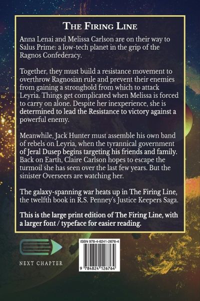 Anna Lenai and Melissa Carlson are on their way to Salus Prime: a low-tech planet in the grip of the Ragnos Confederacy. Together, they must build a resistance movement to overthrow Ragnosian rule and prevent their enemies from gaining a stronghold from which to attack Leyria. Things get complicated when Melissa is forced to carry on alone. Despite her inexperience, she is determined to lead the Resistance to victory against a powerful enemy. Meanwhile, Jack Hunter must assemble his own band of rebels on Leyria, when the tyrannical government of Jeral Dusep begins targeting his friends and family. Back on Earth, Claire Carlson hopes to escape the turmoil she has seen over the last few years. But the sinister Overseers are watching her. The galaxy-spanning war heats up in The Firing Line, the twelfth book in R.S. Penney's Justice Keepers Saga. This is the large print edition of The Firing Line, with a larger font / typeface for easier reading.