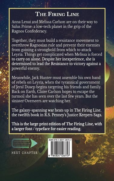 Anna Lenai and Melissa Carlson are on their way to Salus Prime: a low-tech planet in the grip of the Ragnos Confederacy. Together, they must build a resistance movement to overthrow Ragnosian rule and prevent their enemies from gaining a stronghold from which to attack Leyria. Things get complicated when Melissa is forced to carry on alone. Despite her inexperience, she is determined to lead the Resistance to victory against a powerful enemy. Meanwhile, Jack Hunter must assemble his own band of rebels on Leyria, when the tyrannical government of Jeral Dusep begins targeting his friends and family. Back on Earth, Claire Carlson hopes to escape the turmoil she has seen over the last few years. But the sinister Overseers are watching her. The galaxy-spanning war heats up in The Firing Line, the twelfth book in R.S. Penney's Justice Keepers Saga. This is the large print edition of The Firing Line, with a larger font / typeface for easier reading.