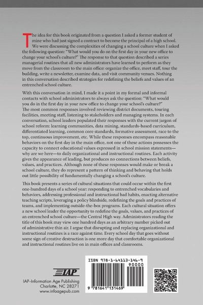 This book presents a series of cultural situations that could occur within the first one-hundred days of a school year: responding to entrenched vocabularies and behaviors, addressing professional and instructional bad habits, enacting alternative teaching scripts, leveraging a policy blindside, redefining the goals and practices of teams, and implementing outside-the-box programs. Each cultural situation offers a new school leader the opportunity to redefine the goals, values, and practices of an entrenched school culture-the Central High way. Administrators reading the title of this book may view one hundred days as an arbitrary number picked out of administrative thin air. I argue that disrupting and replacing organizational and instructional routines is a race against time. Every school day that goes by without some sign of creative destruction is one more day that comfortable organizational and instructional routines live on in main offices and classrooms. The idea for this book originated from a question I asked a former student of mine who had just signed a contract to become the principal of a high school. We were discussing the complexities of changing a school culture when I asked the following question: "What would you do on the first day in your new office to change your school's culture?" The response to that question described a series managerial routines that all new administrators have learned to perform as they move from the classroom to the main office: organize the office, meet staff, tour the building, write a newsletter, examine data, and visit community venues. Nothing in this conversation described strategies for redefining the beliefs and values of an entrenched school culture. With this conversation in mind, I made it a point in my formal and informal contacts with school administrators to always ask the question: "What would you do in the first day in your new office to change your school's culture?" The most common responses involved reviewing district documents, touring facilities, meeting staff, listening to stakeholders and managing systems. In each conversation, school leaders populated their responses with the current jargon of school reform: learning communities, data mining, standards-based curriculum, differentiated learning, common core standards, formative assessment, race to the top, continuous improvement, etc. While these responses encompass reasonable behaviors on the first day in the main office, not one of these actions possesses the capacity to connect educational values expressed in school mission statements-why are we here-to daily organizational and instructional routines. Each activity gives the appearance of leading, but produces no connections between beliefs, values, and practices. Although none of these responses would make or break a school culture, they do represent a pattern of thinking and behaving that holds out little possibility of fundamentally changing a school's culture.