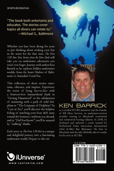 Whether you have been diving for years or just thinking about sticking your fins in the water for the first time, The First 130 Feet: True Stories from the Dive Deck will take you on underwater adventures you won't ever forget. Journey with author Ken Barrick as he explores hidden underwater worlds, from the Inner Harbor of Baltimore to Australia's Coral Sea. This collection of short stories entertains, educates, and inspires. Experience the terror of being face-to-face with a fourteen-foot hammerhead shark in "Getting Hammered" or the exhilaration of swimming with a pack of wild dolphins in "The Company of Dolphins." In "Lost at Sea," you'll discover the helpless feeling of watching your boat drift away toward the horizon-without you aboard, and in "Did You Know?" you'll be amazed by "walking" sharks. Each story in The First 130 Feet is a unique and delightful journey into a fascinating underwater world. Prepare to dive in!