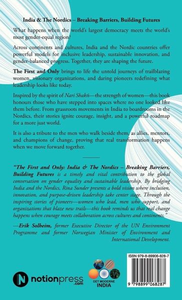 What happens when the world's largest democracy meets the world's most gender-equal region? Across continents and cultures, India and the Nordic countries offer powerful models for inclusive leadership, sustainable innovation, and gender-balanced progress. Together, they are shaping the future. The First and Only brings to life the untold journeys of trailblazing women, visionary organizations, and daring pioneers redefining what leadership looks like today. Inspired by the spirit of Nari Shakti-the strength of women-this book honours those who have stepped into spaces where no one looked like them before. From grassroots movements in India to boardrooms in the Nordics, their stories ignite courage, insight, and a powerful roadmap for a more just world. It is also a tribute to the men who walk beside them, as allies, mentors, and champions of change, proving that real transformation happens when we move forward together. -- "The First and Only: India & The Nordics - Breaking Barriers, Building Futures is a timely and vital contribution to the global conversation on gender equality and sustainable leadership. By bridging India and the Nordics, Rina Sunder presents a bold vision where inclusion, innovation, and purpose-driven leadership take center stage. Through the inspiring stories of pioneers - women who lead, men who support, and organizations that blaze new trails - this book reminds us that real change happens when courage meets collaboration across cultures and continents." -Erik Solheim, former Executive Director of the UN Environment Programme and former Norwegian Minister of Environment and International Development.