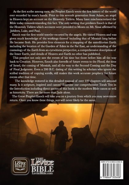 As the first scribe among men, the Prophet Enoch wrote the first history of the world ever recorded by man's hands. Prior to this seventh generation from Adam, an angel in Heaven kept an account on the Heavenly Tablets. Many have mischaracterized the Bible today misunderstanding this fact. The only writing that predates Enoch is that of the Heavenly Tablets which accounts were provided to Moses on Mt. Sinai affirmed by Jubilees, Luke, and Paul. Enoch was the first world traveler escorted by the angels. He visited Heaven and was given much knowledge of the workings thereof including that of Messiah long before He became flesh. He provides firm elements for a mapping of the antediluvian Earth including the location of the Garden of Eden in the Far East, an understanding of the cosmology of the Earth from an eyewitness perspective, a comprehensive description of the Inner Earth, and details of Heaven and Earth no other has published. This prophet not only saw the events of his time but those before him all the way back to Creation. However, Enoch also foretells of future events to the Flood, the time of Israel, the coming of Messiah, and all the way to the Second Coming and the Day of Final Judgment. Even a 200 B.C. dating of this writing by scholars who ignore the scribal tradition of copying scrolls, still makes this work accurate prophecy for future events after that time. The knowledge restored in this detailed manual of over 100 chapters will astound many. Is it scripture, inspired and canon? Examine our comprehensive Torah Test in the Introduction including direct quotes of this book in the modern Bible canon as well as historicity. There are far more than Jude alone. The Great Prophet Enoch will take you on a journey from which you may nevermore return. Once you know these things, you will never likely be the same. This is a publishing of the original translation by R.H. Charles in which we have full copyright rights under Library Of Congress Control Number: 1-11193958781.