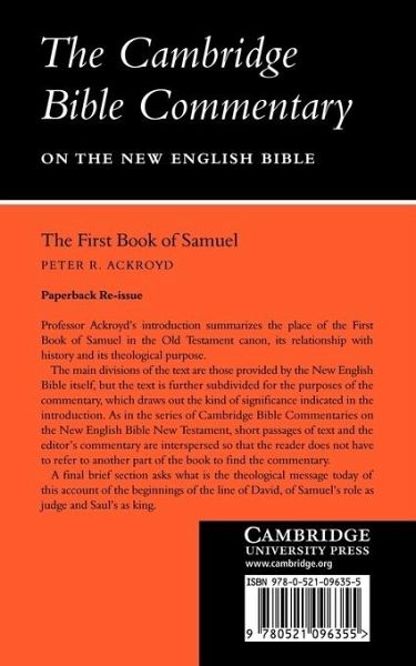Professor Ackroyd's introduction summarizes the place of the First Book of Samuel in the Old Testament canon, its relationship with history and its theological purpose. The main divisions of the text are those provided by the New English Bible itself, but the text is further subdivided for the purposes of the commentary, which draws out the kind of significance indicated in the introduction. As in the series of Cambridge Bible Commentaries on the New English Bible New Testament, short passages of text and the editor's commentary are interspersed so that the reader does not have to refer to another part of the book to find the commentary. A final brief section asks what is the theological message today of this account of the beginnings of the line of David, of Samuel's role as judge and Saul's as king.