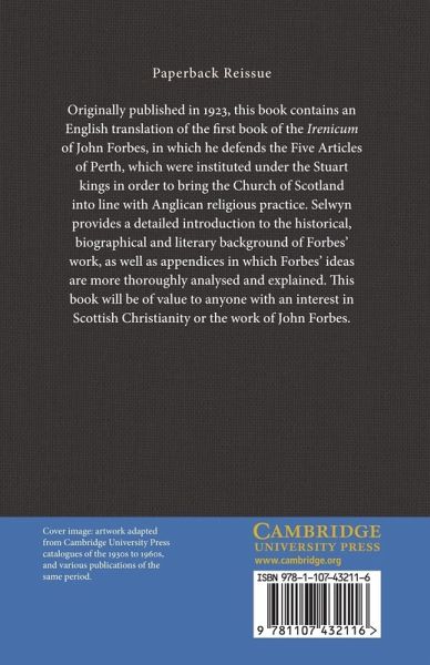 Originally published in 1923, this book contains an English translation of the first book of the Irenicum of John Forbes, in which he defends the Five Articles of Perth, which were instituted under the Stuart kings in order to bring the Church of Scotland into line with Anglican religious practice. Selwyn provides a detailed introduction to the historical, biographical and literary background of Forbes' work, as well as appendices in which Forbes' ideas are more thoroughly analysed and explained. This book will be of value to anyone with an interest in Scottish Christianity or the work of John Forbes.