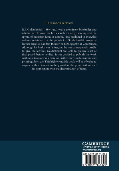 E.P. Goldschmidt (1887-1954) was a prominent bookseller and scholar well known for his research on early printing and the spread of humanist ideas in Europe. First published in 1955, this volume originated in the proofs for Goldschmidt's inaugural lecture series as Sandars Reader in Bibliography at Cambridge. Although his health was failing, and he was consequently unable to give the lectures, Goldschmidt was able to prepare a set of final proofs before he died. It was decided to publish the work without alterations as a basis for further study on humanism and printing after 1500. This highly readable book will be of value to anyone with an interest in the growth of the print medium and its connection with the dissemination of ideas.