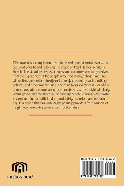 This novella is a compilation of stories based upon historical events that occurred prior to and following the attack on Pearl Harbor, Territorial Hawaii. The situations, issues, themes, and outcomes are partly derived from the experiences of the people who lived through those times and whose lives were either directly or indirectly affected by social, military, political, and economic fortunes. The main focus examines issues of discrimination, fate, determination, community versus the individual, charity versus greed, and the sheer will of ordinary people to transform a hostile environment into a fertile land of productivity, inclusion, and opportunity. It is hoped that this work might possibly provide a fresh window of insight into developing a more constructive future.