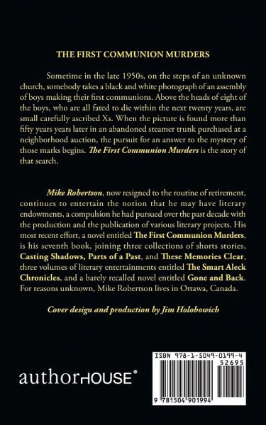 Sometime in the late 1950s, on the steps of an unknown church, somebody takes a black and photograph of an assembly of boys making their first communions. Above the heads of eight of the boys, who are all fated to die within the next twenty years, are small carefully ascribed Xs. When the picture is found more than fifty years years later in an abandoned steamer trunk purchased at a neighborhood auction, the pursuit for an answer to the mystery of those marks begins. The First Communion Murders is the story of that search.