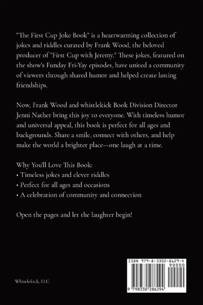 Brighten Your Day with a Collection of Jokes and Riddles from Funday Fri-Yay Discover the magic of laughter with "The First Cup Joke Book," a delightful collection of jokes and riddles that transcends backgrounds, personalities, and borders. Curated by Frank Wood, the beloved producer of the much-celebrated "First Cup with Jeremy," this book brings together the best of Funday Fri-Yay episodes to spread joy and create connections. A Legacy of Laughter For years, Frank Wood's knack for humor transformed Funday Fri-Yay into a beloved tradition on "First Cup with Jeremy: The Martial Arts Morning Show." The jokes and riddles featured in this book were instrumental in uniting a community of coffee-loving martial artists and viewers who forged lasting friendships through shared laughter. A Universal Appeal Though born from a unique community, the humor in this collection is universal. Frank Wood and whistlekick Book Division Director Jenni Nather have carefully selected jokes and riddles that anyone can enjoy, regardless of their background or interests. This book is designed to bring smiles to faces everywhere, uniting people through the simple joy of laughter. A Vision for a Brighter World "The First Cup Joke Book" is more than just a joke book. It is a beacon of hope in a sometimes dreary world, encouraging people to connect and share joy. Frank and Jenni's vision is to create a ripple effect of happiness that spreads across the globe, one laugh at a time. Why You'll Love This Book: Timeless Humor: Enjoy a mix of classic jokes and clever riddles that never go out of style. Community Spirit: Sample the warmth and camaraderie that made Funday Fri-Yay a favorite among "First Cup with Jeremy" fans. As you read through this collection of humor, be mindful that you are connected through joy with countless others around the globe. Perfect for All Ages: Share these jokes and riddles with family, friends, and colleagues, regardless of age or background. Beautifully Presented: This book is crafted with love and care, making it a perfect gift for any occasion. Whether you're a longtime fan of "First Cup with Jeremy" or someone looking for a good laugh, "The First Cup Joke Book" promises to deliver joy and connection. Open its pages and let the laughter begin!