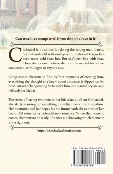 Can true love conquer all if you don't believe in it? Twenty-five-year-old copywriter Christabel Evans is notorious for dating the wrong men. Lately, her hot-and-cold relationship with boyfriend Logan has been more cold than hot. But she's just fine with that. Christabel doesn't believe she is in the market for a love connection, with Logan or anyone else. Along comes charismatic Eric. Within moments of meeting him, everything she thought she knew about romance is flipped on its head. He is everything she thought she never wanted. Afraid of her growing feelings for him, she insists they are and will only be friends. The stress of having two men in her life takes a toll on Christabel. She finds herself yearning for something more than her current situation, even with Logan taking her by surprise more than once. Her memories and her hopes for the future battle for control of her heart. Old romance vs potential new romance. When the moment comes, she wants to be ready. The trick is in knowing which moment is the right one.