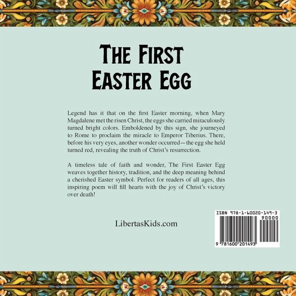 Legend has it that on the first Easter morning, when Mary Magdalene met the risen Christ, the eggs she carried miraculously turned bright colors. Emboldened by this sign, she journeyed to Rome to proclaim the miracle to Emperor Tiberius. There, before his very eyes, another wonder occurred-the egg she held turned red, revealing the truth of Christ's resurrection. A timeless tale of faith and wonder, The First Easter Egg weaves together history, tradition, and the deep meaning behind a cherished Easter symbol. Perfect for readers of all ages, this inspiring poem will fill hearts with the joy of Christ's victory over death! LibertasKids.com