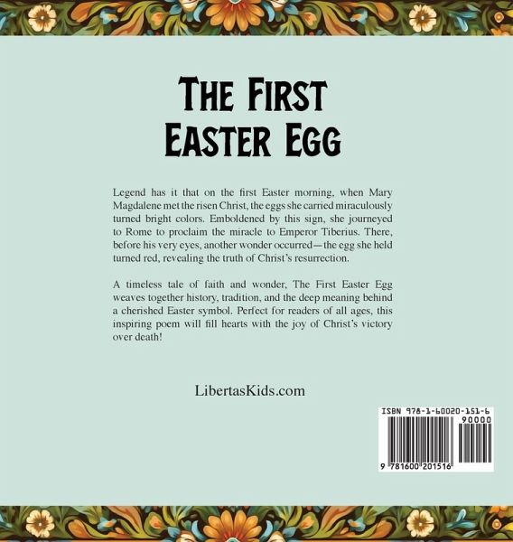 Legend has it that on the first Easter morning, when Mary Magdalene met the risen Christ, the eggs she carried miraculously turned bright colors. Emboldened by this sign, she journeyed to Rome to proclaim the miracle to Emperor Tiberius. There, before his very eyes, another wonder occurred-the egg she held turned red, revealing the truth of Christ's resurrection. A timeless tale of faith and wonder, The First Easter Egg weaves together history, tradition, and the deep meaning behind a cherished Easter symbol. Perfect for readers of all ages, this inspiring poem will fill hearts with the joy of Christ's victory over death! LibertasKids.com